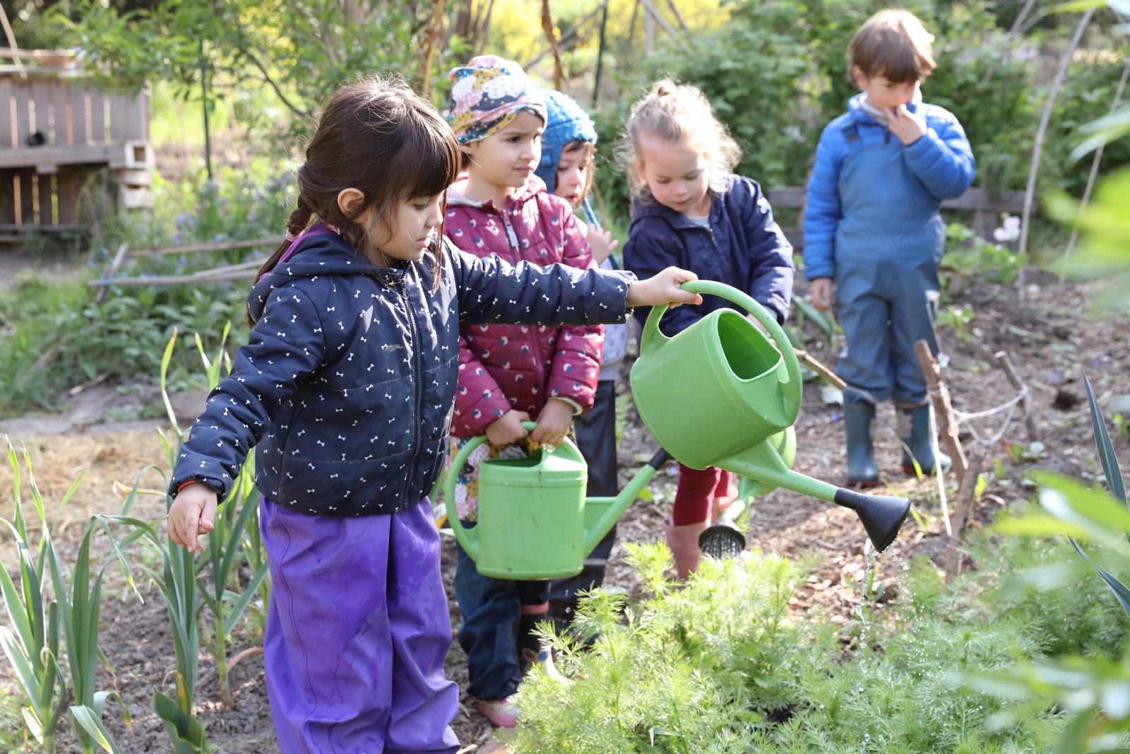 Le projet intitulé « L’Enfant et son Jardin se créent » est animé par deux jardinières qui accueillent chaque matin les enfants de leurs groupes respectifs dans un potager pédagogique. Les activités quotidiennes s’y mêlent naturellement aux gestes du jardinage : préparation de la terre, bêchage, ratissage, taille, semis, plantations et récoltes.